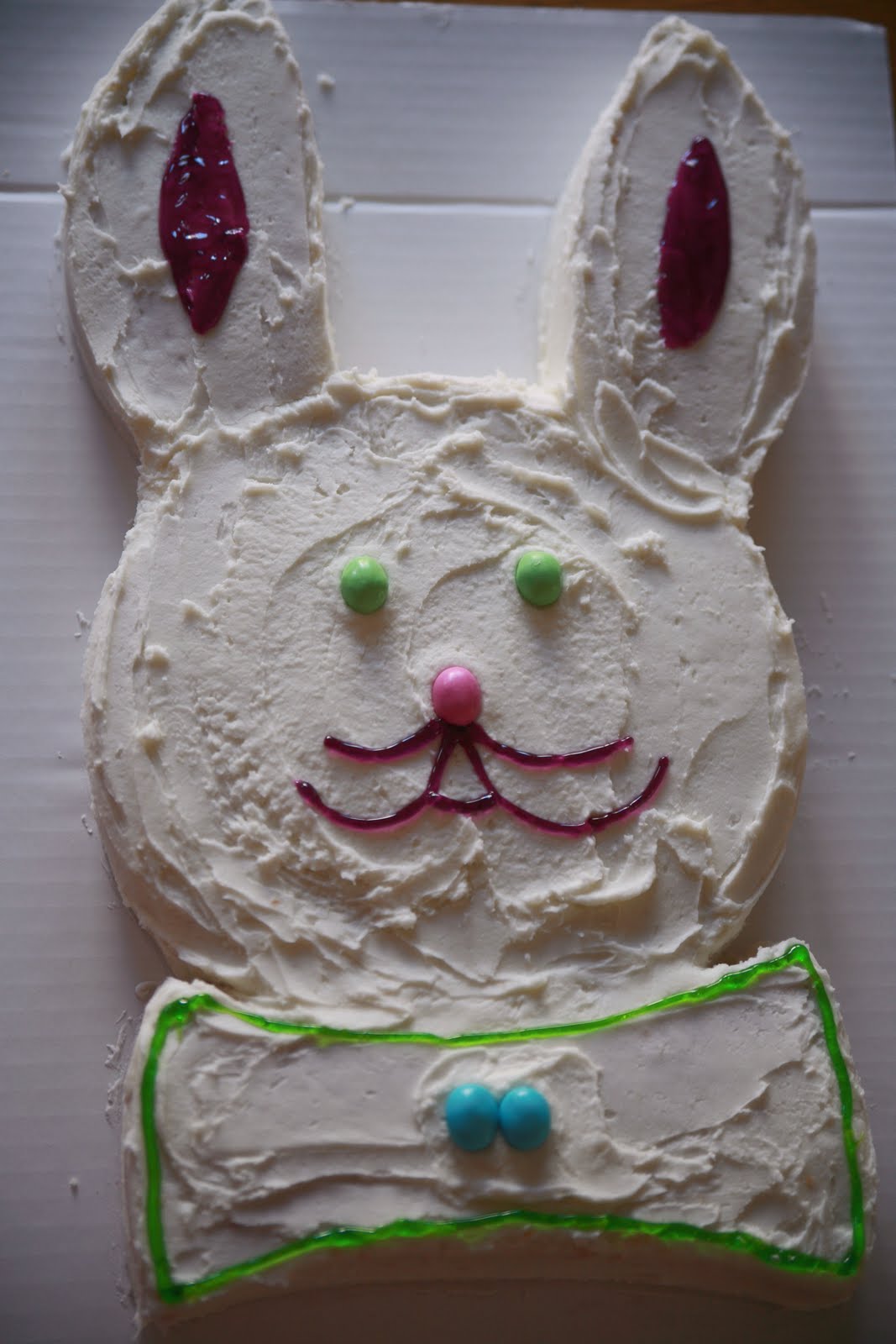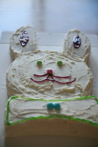 Have you met Peter Cottontail? He is white and fluffy and perfect for Easter. My kids had fun with this cake. White cake with white icing both with a hint of almond.