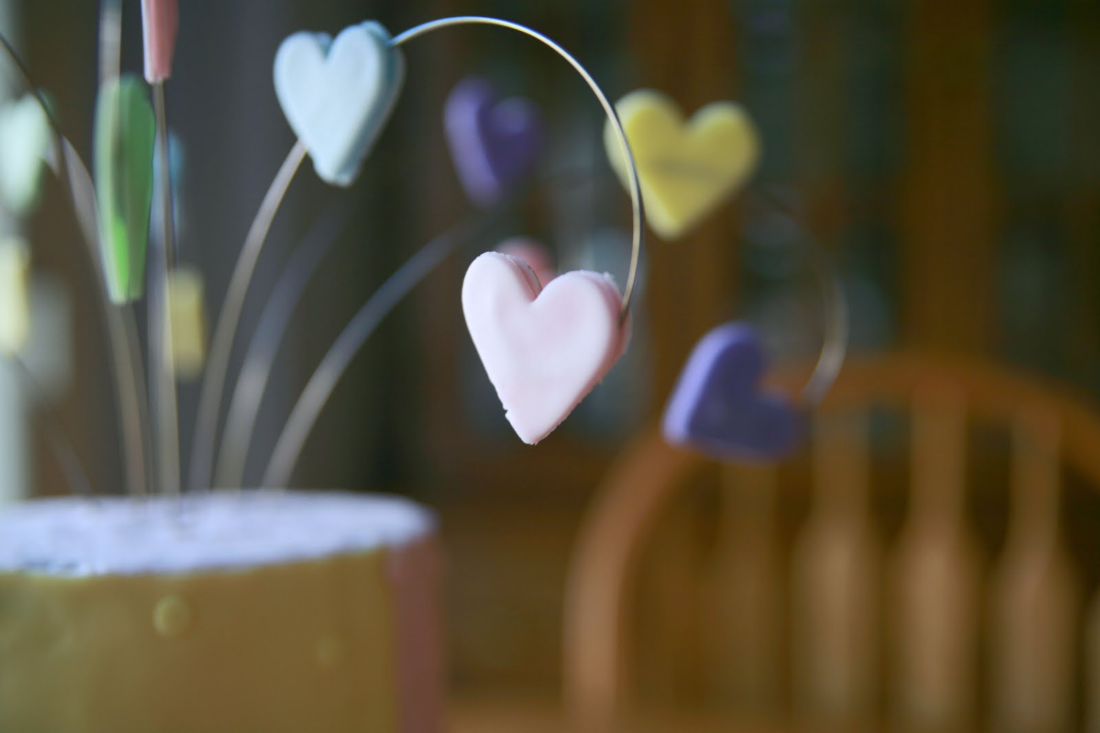 The cake is chocolate filled with light pink buttercream. Fondant square of pastel baby colors (yellow, blue, green, purple, and pink) applied to the sides of each cake in a patchwork fashion. I used the leftover heart cutouts as the topper.