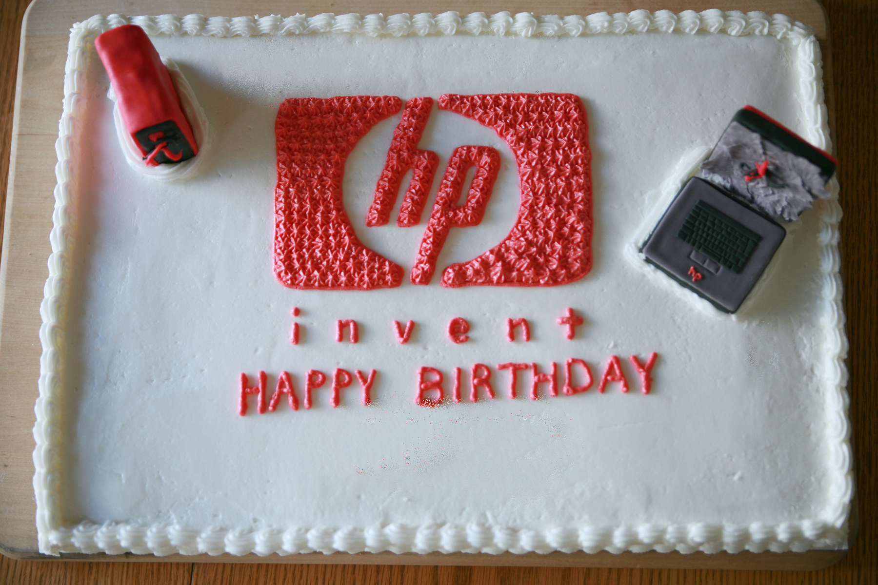 A customer asked if I could make a birthday cake for her husband who works at Hewlett Packard. He fixes computer, servers, etc. I asked what his favorite color is and went to work. I started with a chocolate sheet cake with vanilla buttercream icing. I placed the Hewlett Packard logo in the middle and used red tinted buttercream to fill it in.
