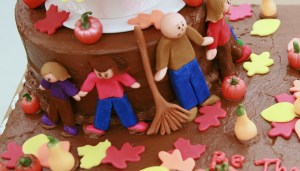 Prior to the competition, I made the pumpkins and gourds with different shades of orange fondant. I used green tinted fondant for the tops with some moss green coloring to enhance the “real” life look of the pumpkins. I also dusted the pumpkins with green shimmer dust and the gourds with gold dust. I also made our family ahead of time. I just rolled out fondant in different shades depending on who I was making. I decided to personalized the peeps with our favorites colors. Mazie is wearing blue jeans with pink shoes and a pink shirt. Jamie is wearing purple and brown. Jacob is wearing green and blue jeans. Jeremiah is wearing a brown shirt with blue jeans and I am wearing red and brown. I didn’t have molds to make my peeps so everything was by hand! Oh, and I made a rake for Jeremiah to have. I was happy with how they turned out…