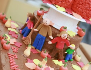 I put a shell border around the bottom of the half sheet and round cakes. Then I placed my family around the round cake. I placed the gourds and pumpkins. I also rolled out red, yellow, and orange tinted fondant and used small leave cutters for the leaves. I placed them around the gourds and pumpkins and filled in around the top pumpkin cakes.