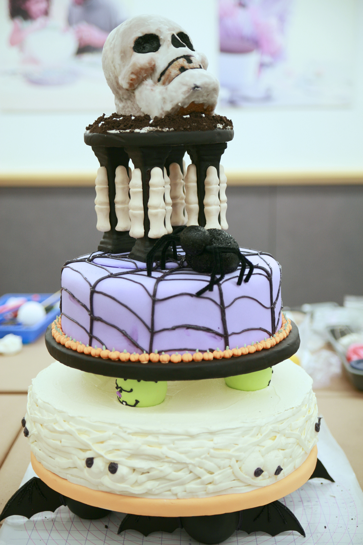 Now on to my competition! This is my friend and classmate’s cake. She did an amazing job on her cake. With a mummy, spiderweb, and skull for her cakes, she paid amazing attention to detail. The spider, bats, Frankensteins, and finger pillars are all fondant. I was very surprised she did not win! It is a very spooky cake.