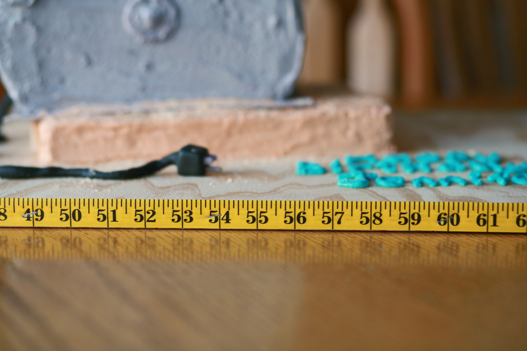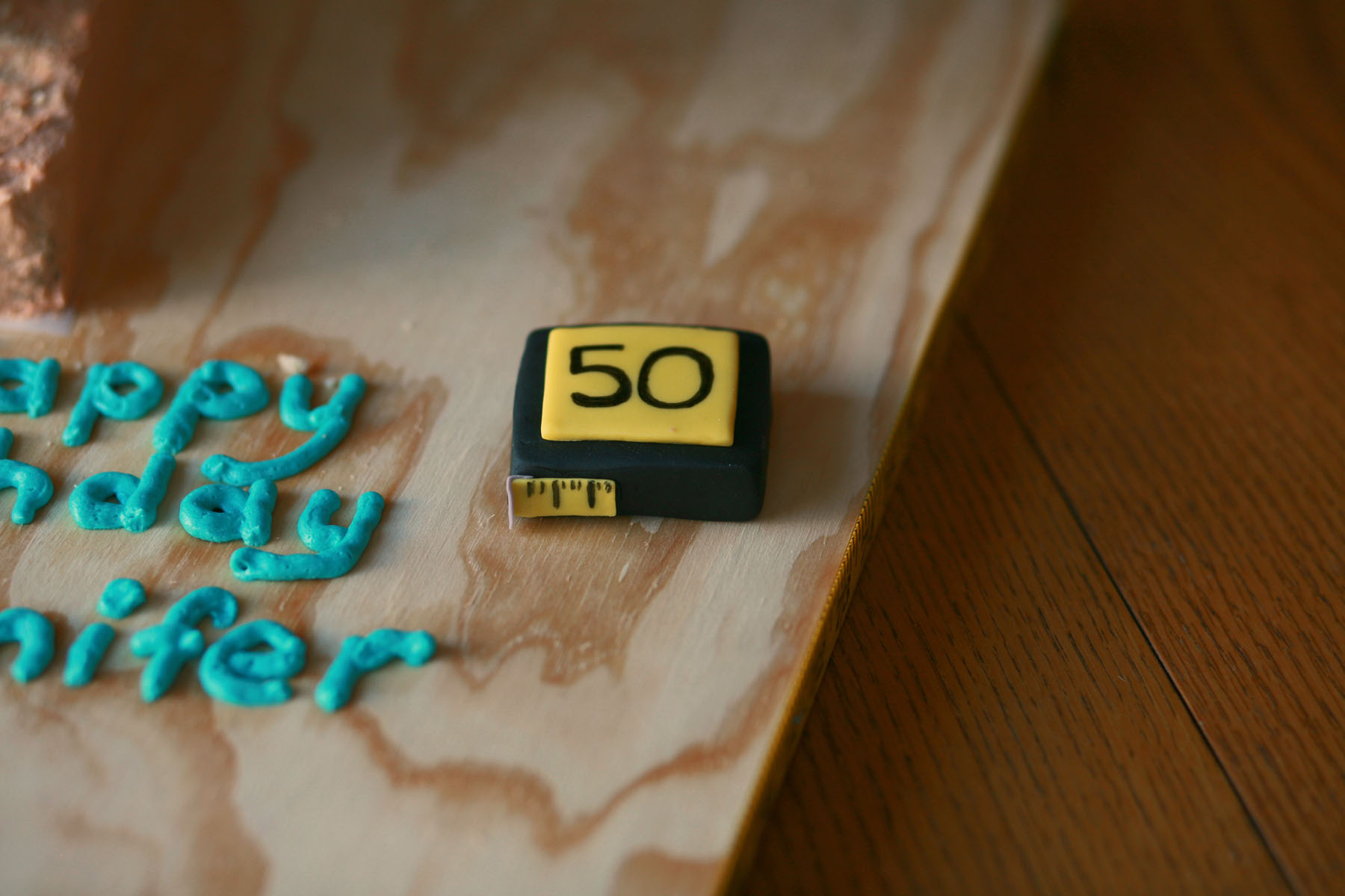 The only fondant I used was for the “accessories”. I made a tape measure that had the 50 on it for her big birthday. The guide for the saw was fondant tinted grey and then sprayed with edible luster spray for a sheen finish. I also did the cord and plug were out of fondant as well.