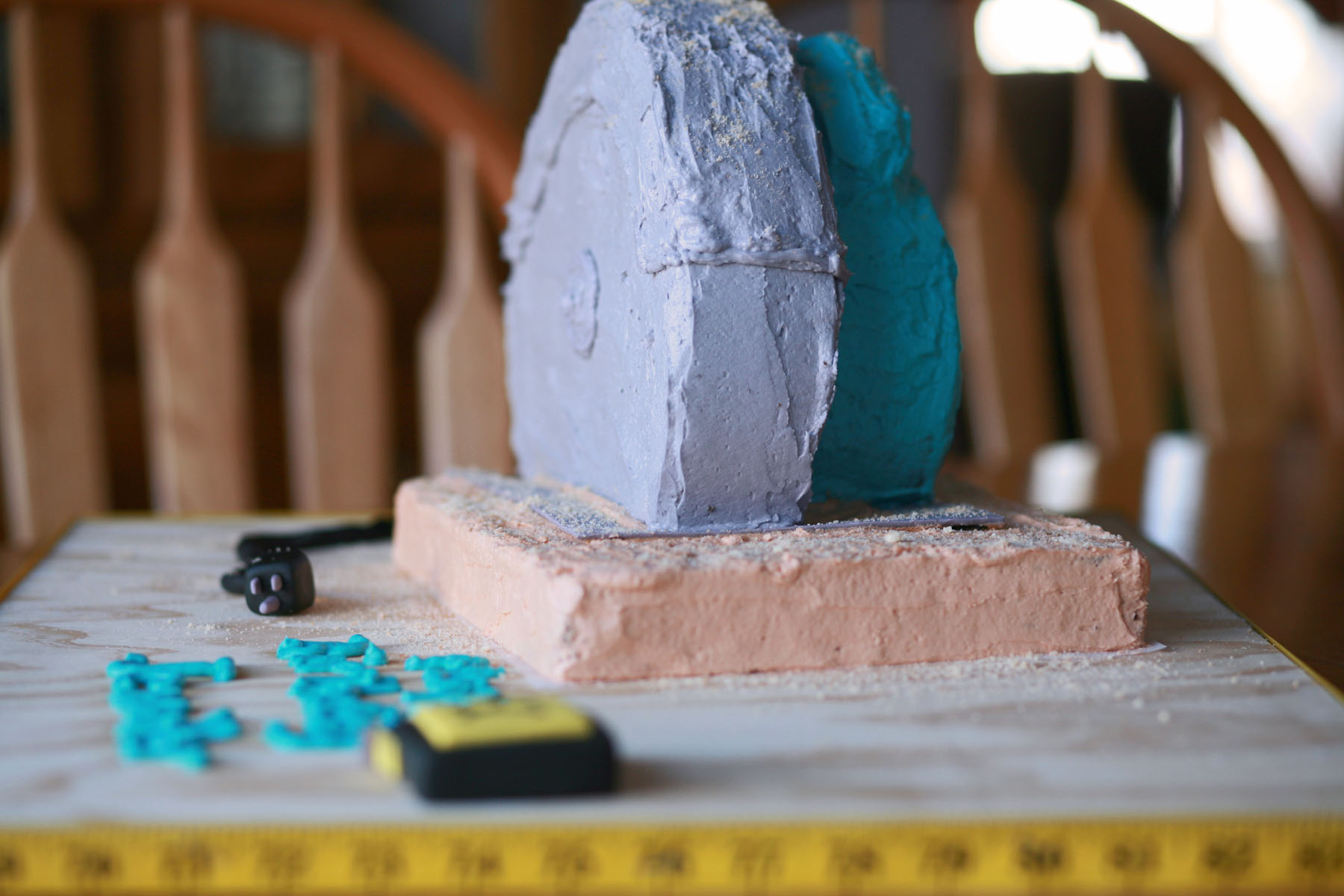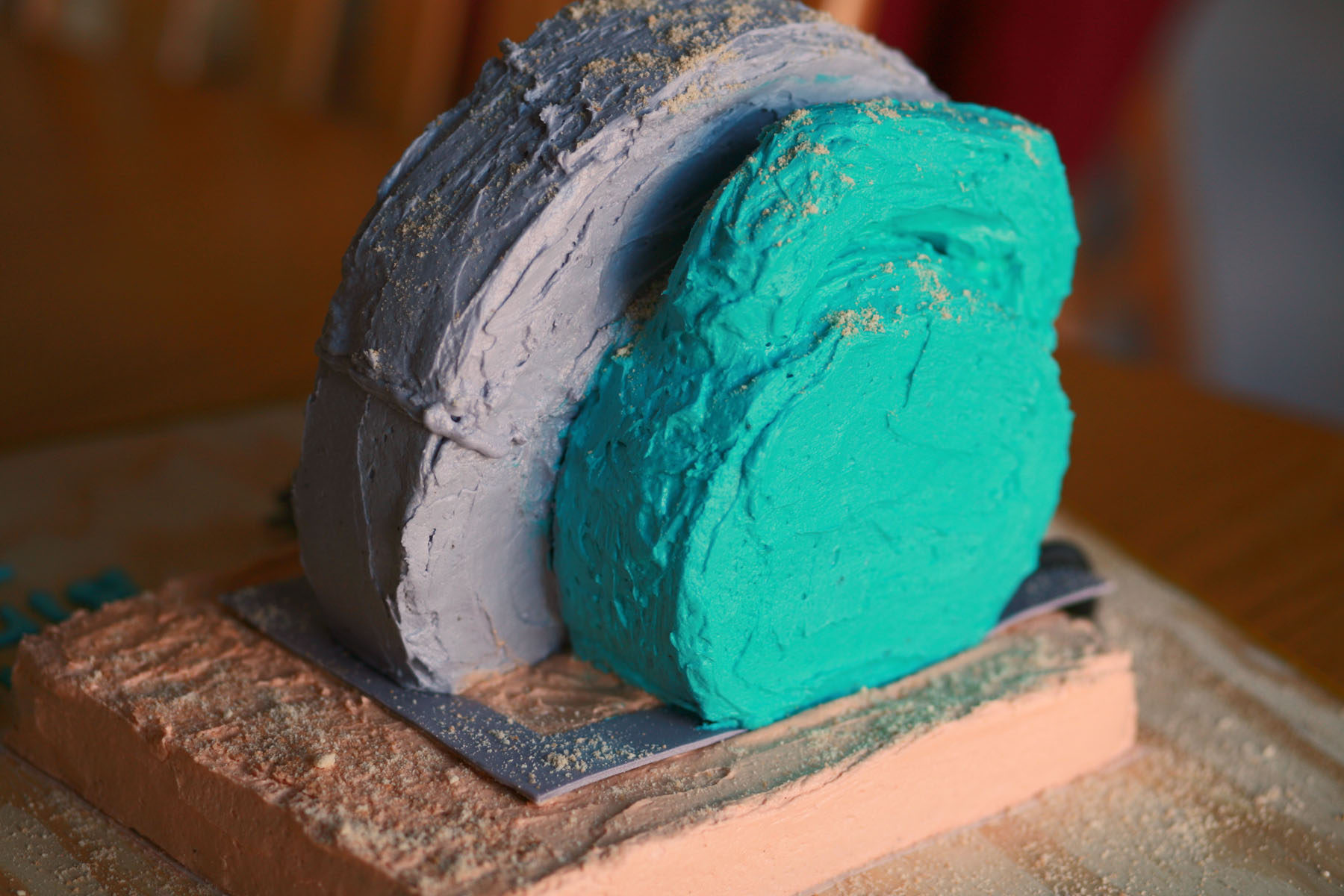 The “board” that being cut by the saw was a quarter sheet cake with buttercream icing tinted to the blonde shade of wood. The motor was a 6 inch round standing on its side. The saw blade was a 10 inch round cut so it would sit flat on the “wood” piece and iced with grey tinted buttercream. The handle on the motor was 5 marshmallows put together with toothpicks and iced with teal tinted buttercream.