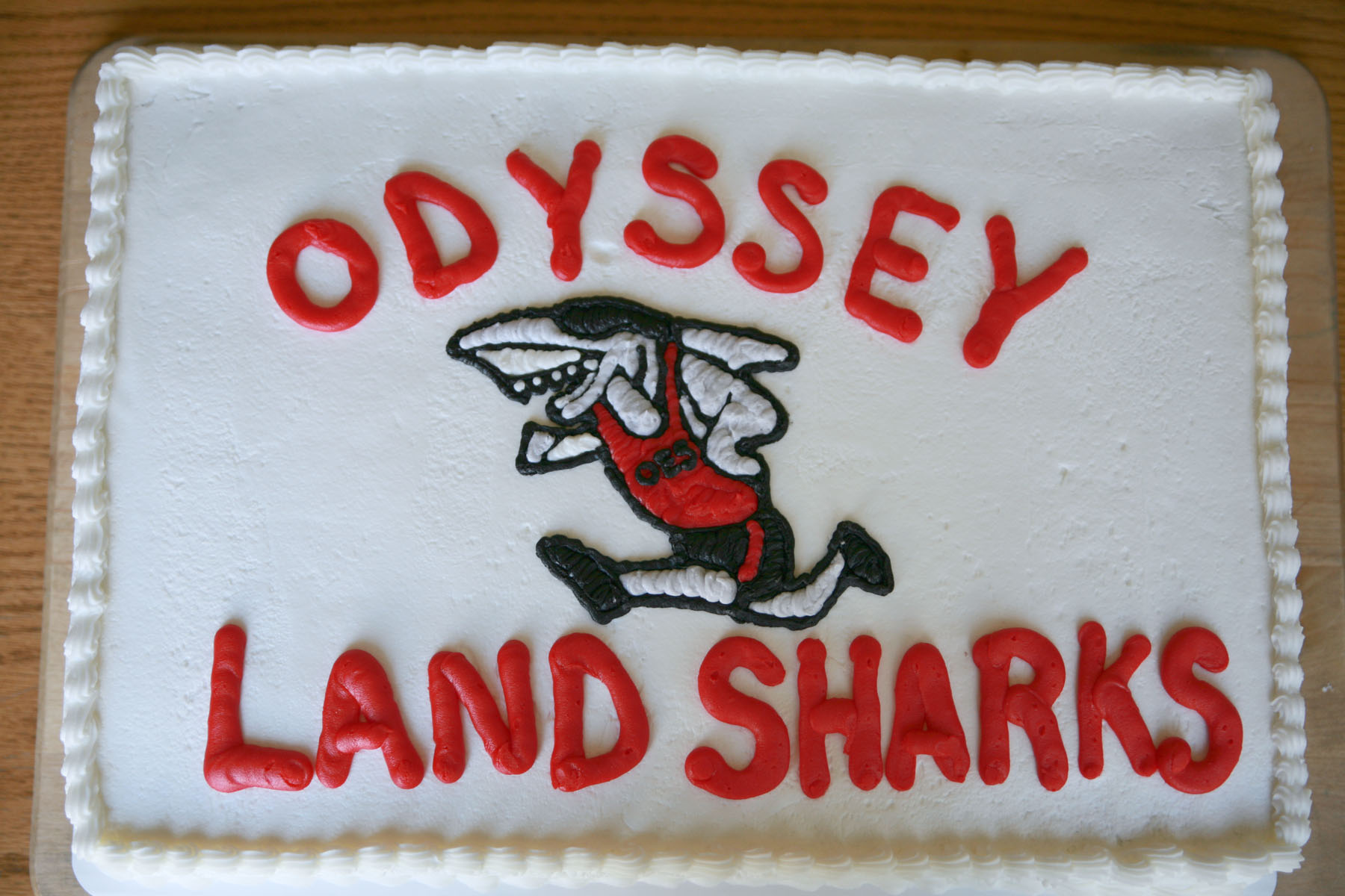 One of my daughters signed up for Landsharks Running club through school this Spring. She enjoyed it so much. The practices and three meets. She ran her little heart out. So when it came time for the team to have a party, she wanted me to make a cake! Of course, I obliged. She insisted on chocolate cake with vanilla buttercream and I had to put the Landsharks shark on the cake.