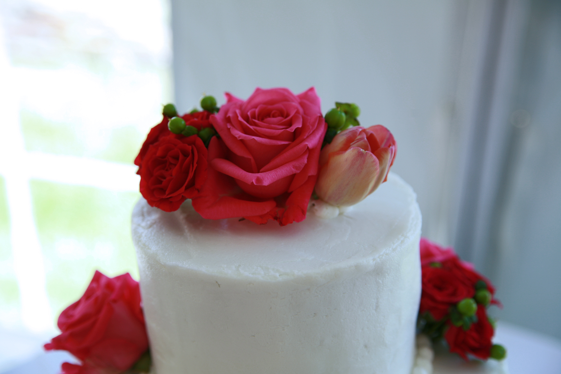 They had fresh flowers waiting for me at the reception location. I stacked the cake and placed the flowers.