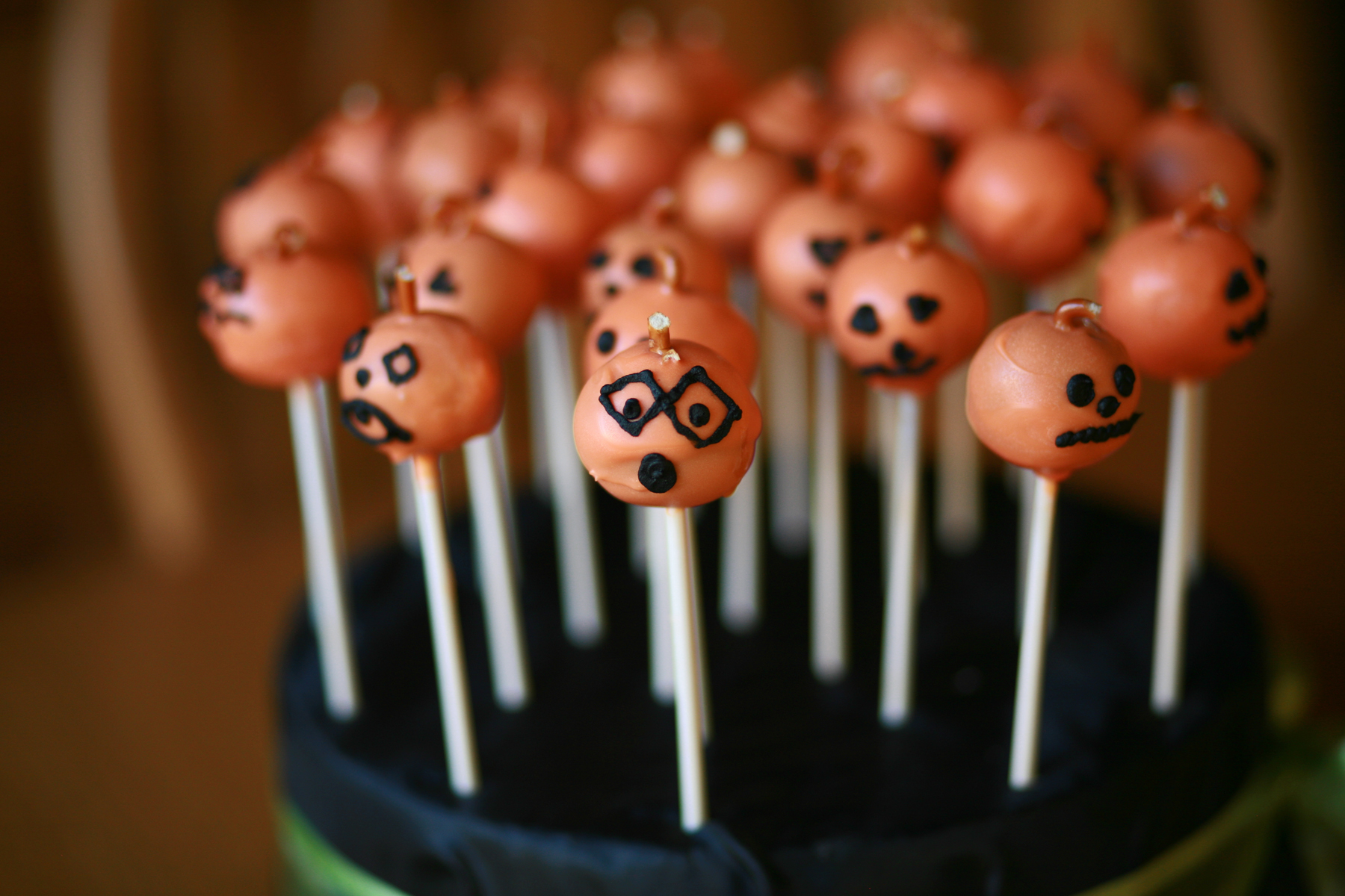 Today my three children had parties at school for Halloween.  Thankfully, two of them agreed on the same treat to share with their classes making a little easier for this mama!  My son wanted cake pops.  My daughter agreed that they would be perfect if I could make them look like jack-o-lanterns.  I made dark chocolate fudge cake pops and dipped them into orange candy melts.  Then I used black tinted buttercream to add faces.  I covered an 8 inch styrofoam cake drum in green fabric with a black ribbon for my son’s party…