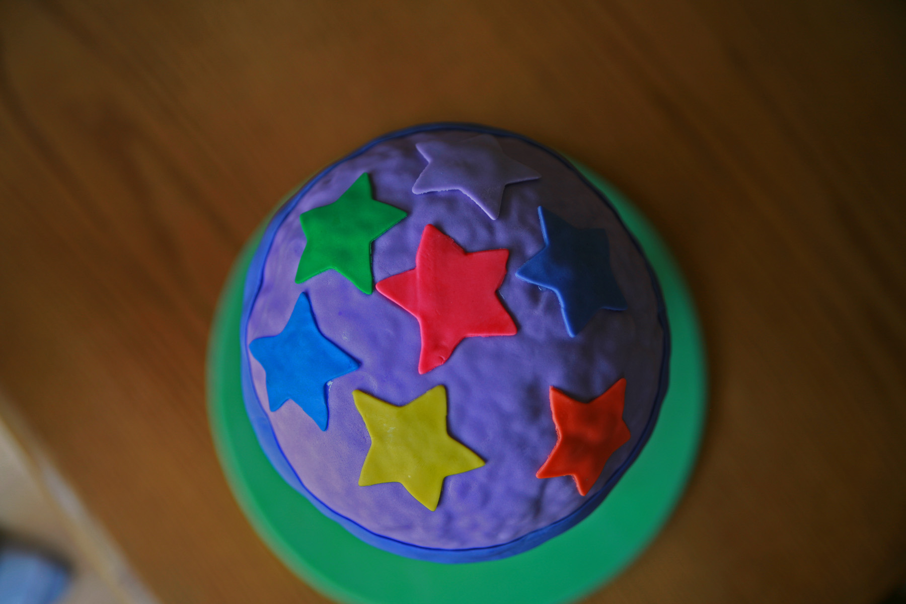 I started with rice krispie candy molded in a pail and a Pyrex bowl to make the balloon part of the cake. After it was completely cool and formed to the bowls, I put them together with dowel rods and covered it with purple fondant. After finishing the rainbow that my daughter wanted for the balloon, I added some stars in the same colors on the top of the balloon and 7s around the balloon with purple edible marker.