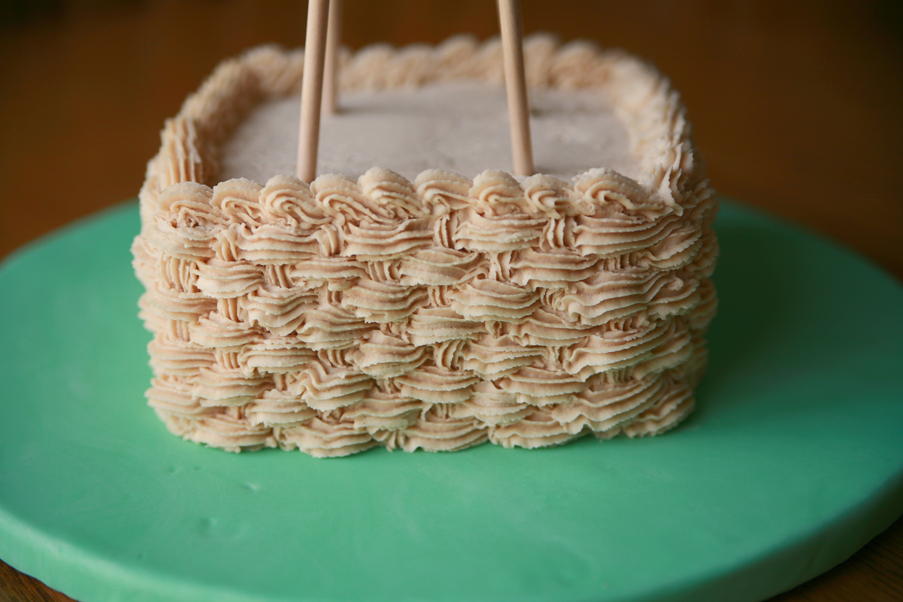 I then made chocolate cake (my daughter’s favorite) in 6 inch square pans. I did a basket weave with peanut butter icing (again my daughter’s request) to make the squares look like a hot air balloon basket.
